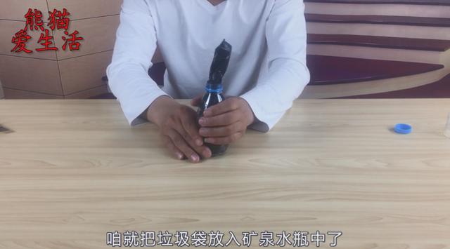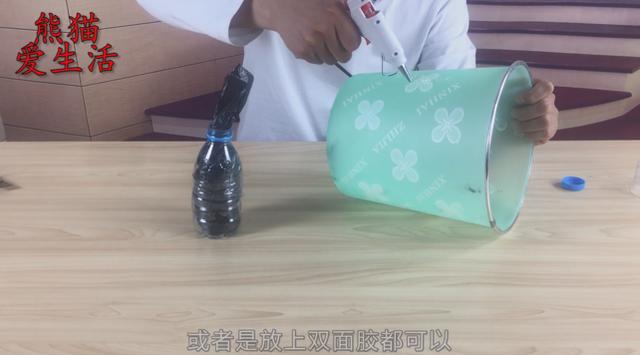然后把我们的矿泉水瓶粘在垃圾桶的一旁